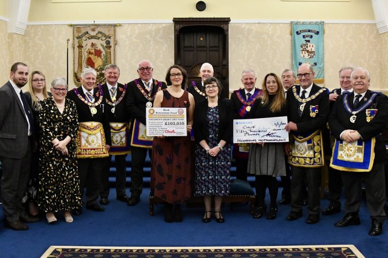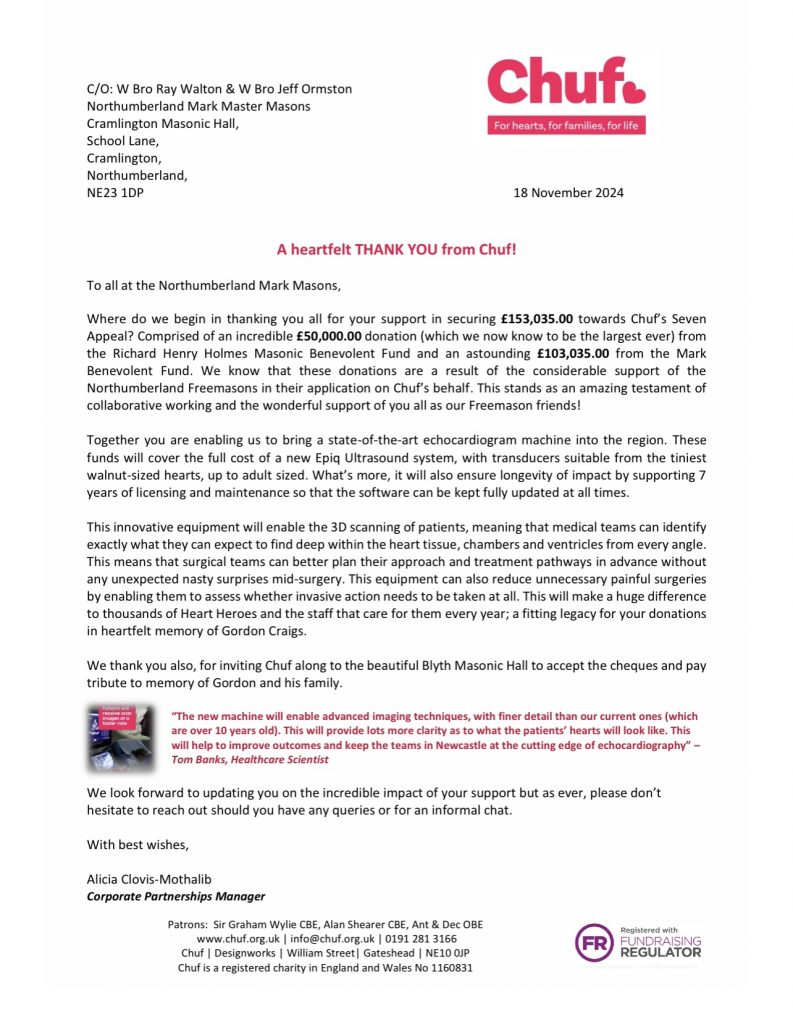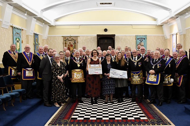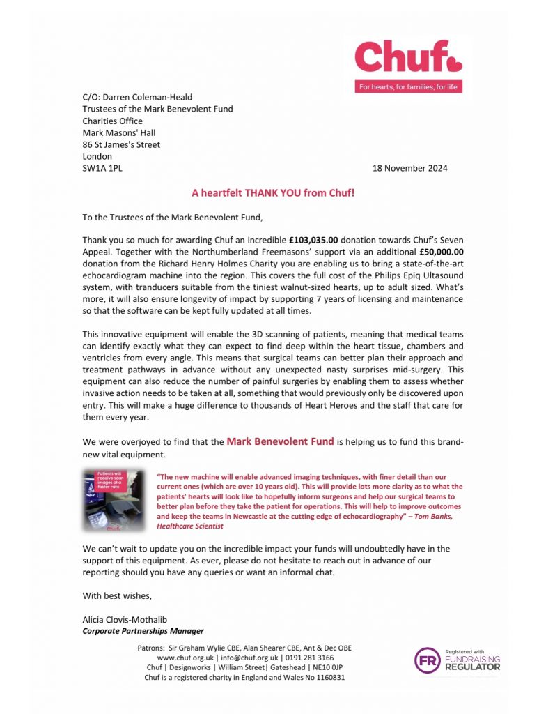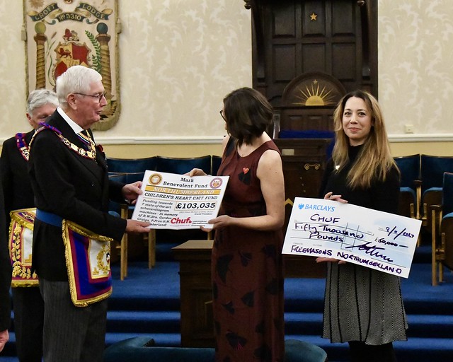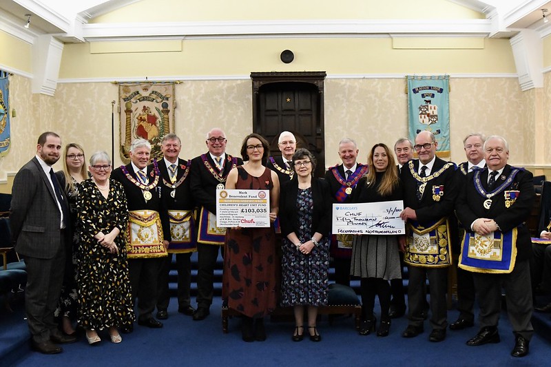 The presentation of these two cheques occurred in memory of R. W. Bro. Gordon Craigs, the Past Provincial Grand Master of the Mark Province of Northumberland, who was also an Assistant Provincial Grand Master in the Craft and Deputy Grand Superintendent in the Royal Arch at the time of his sudden and tragic death in July. R. W. Bro. Gordon became very supportive of the work of CHUF following the invaluable treatment his grandson received shortly after he was born and was very grateful for its life-saving work.