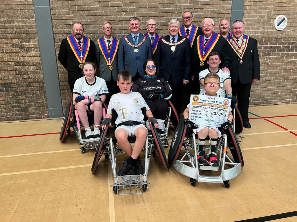 The second cheque was for £35,799 and was presented to the North East Barbarians at Blyth Sports Centre. This was used to provide eight junior wheelchairs for under 16’s with disabilities to enable them to play rugby.