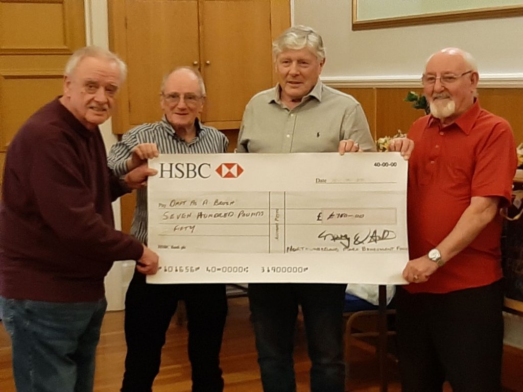 The night went very well and our PGM R.W. Bro Raymond Walton, along with W. Bros. Tom Grey, Graham Rowley and Alex Finlay, were delighted to be able to present a cheque for £750 to the Charity.